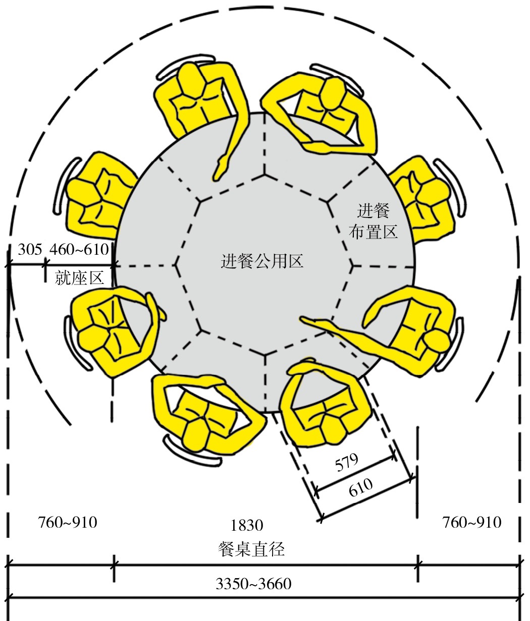 在设计餐厅空间时,确定就餐面、就座间距与就餐高度是餐厅人体尺寸中需要了解的主要内容。