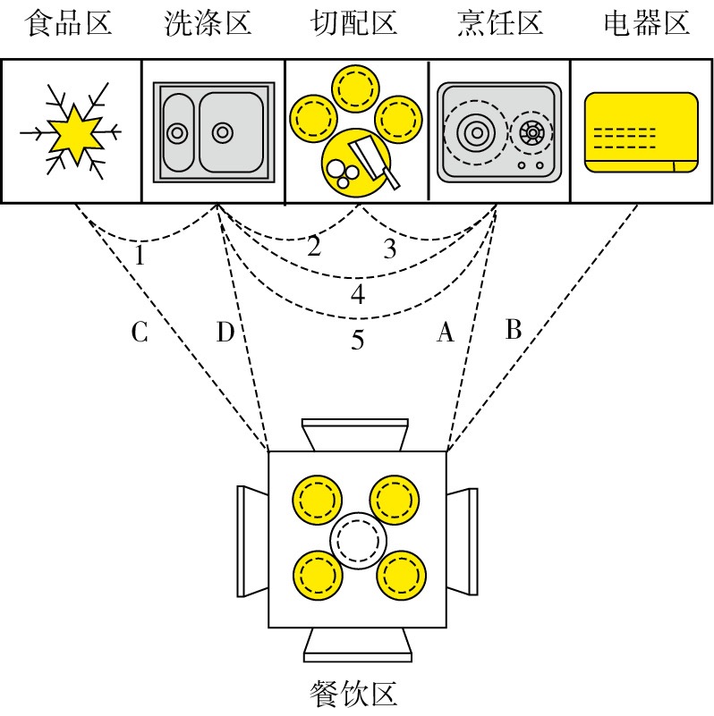 三者之间的距离要确保不重复、不拖沓。若动线过长,会增加往返的距离,降低工作效率,加快疲劳。动线过短,则会产生互相干扰的情况,不易于操作